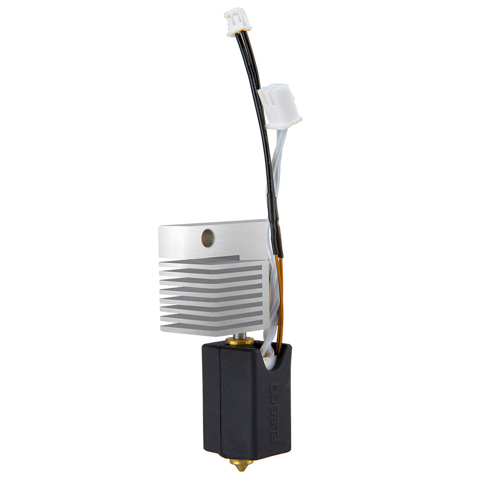 O hotend integrado é capaz de atingir até 300 °C, permitindo trabalhar com diversos materiais como PLA, PETG, ABS, TPU e nylon. O conjunto inclui heatbreak em liga de titânio para melhor dissipação térmica, bloco aquecedor em latão e aquecedor cerâmico de 60 W, que garante aquecimento rápido e fusão estável do filamento.